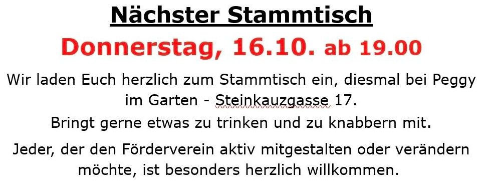 Nächster Stammtisch ist am Mittwoch, den 29.09. gegen 20h. Wir treffen uns bei Peggy im Garten. Steinkauzgasse 17. Alle sind willkommen und niemand muss damit rechnen, dass er Aufgaben mit nach Hause bekommen muss. Anmeldungen per eMail wären nett, aber nicht zwingend nötig. Ich werde eh ein paar Plätze mehr bestellen.